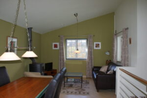 - Large open and well equipped kitchen consists of a 5-burner induction cooktop and electric stove, refrigerator/freezer and a dishwasher. Stairs continue down to another level where the bedroom is located