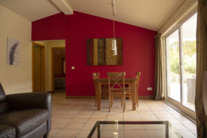 - Large living room with cosy dining and sitting area with French windows leading to a large veranda