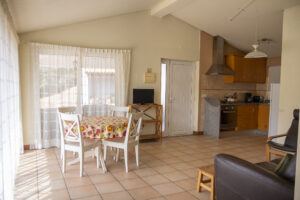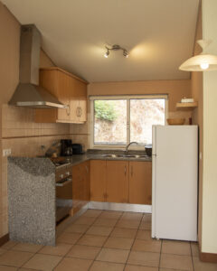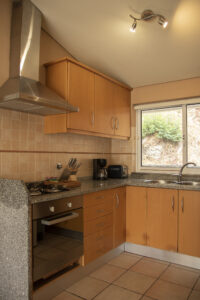• Small, well equipped open plan kitchen with gasoven with a 4 burner hob and refrigerator/freezer